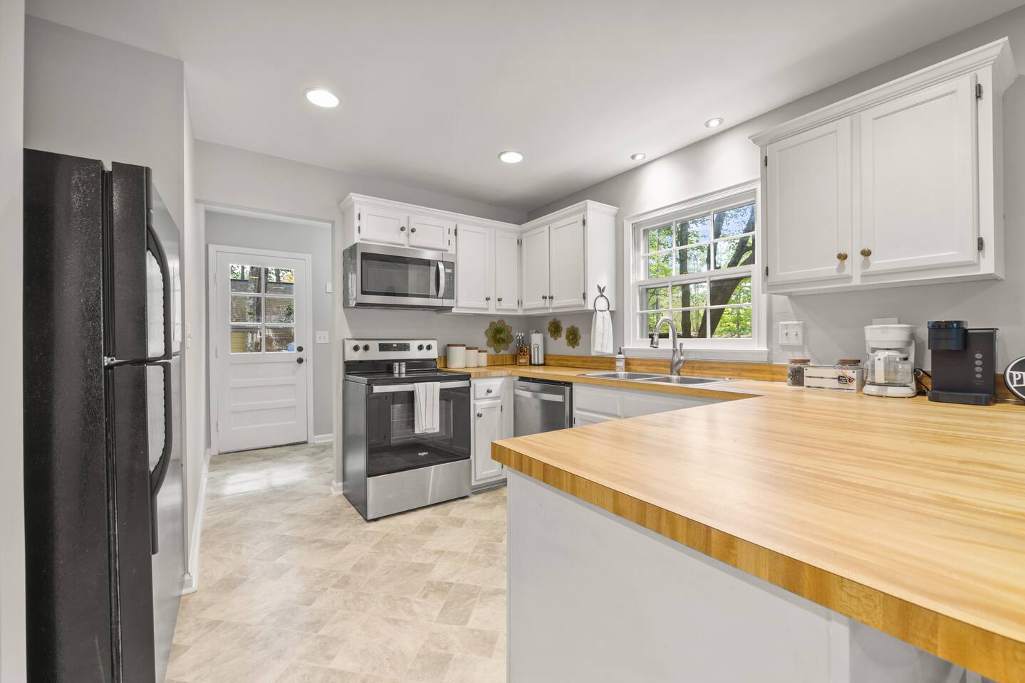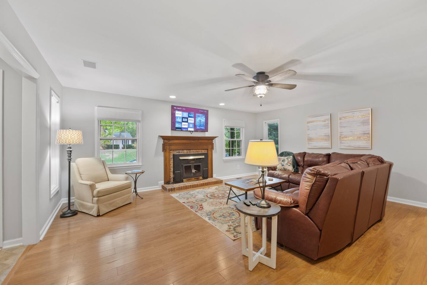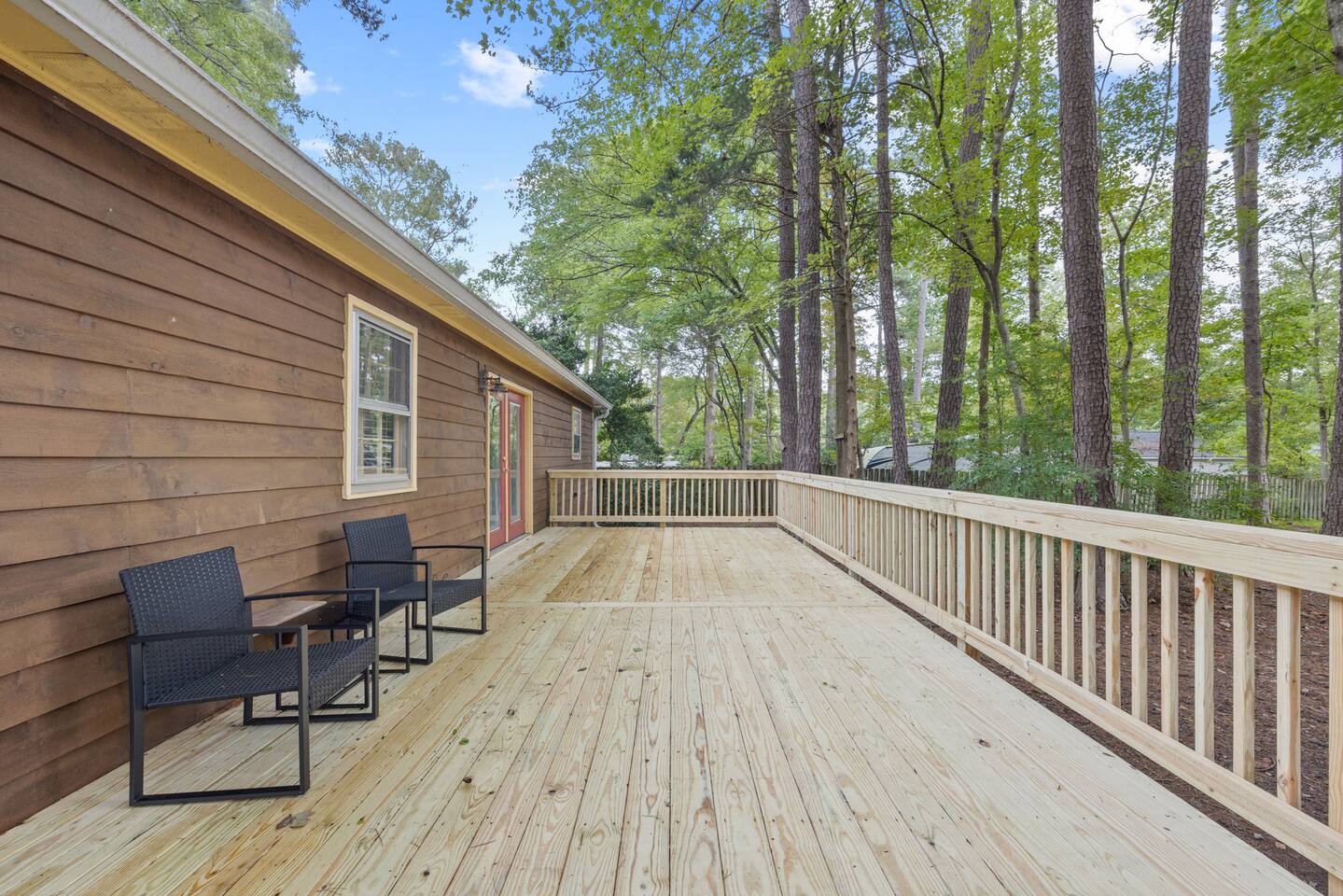KEY FEATURES: ☀ Open floor plan on a quiet Cul De Sac ☀ Updated en suite and large walk in closet ☀ 3 comfortable bedrooms; 1 kings, 2 queen ☀ Fully stocked kitchen updated appliances ☀ Cozy living room w/ 55-inch smart TV, L-couch, board games, and puzzles ☀ Coffee bar with all the fixins ☀ Snacks and water ☀ High-speed Wifi ☀ Fully stocked bathrooms ☀ Front porch with chairs and table ☀ Washer + Dryer ☀ Iron and Ironing Board ☀ Located near downtown Raleigh ☀ Free parking ☀ Park-Like backyard with huge deck and grill ☀ Free parking with private driveway ☀ 6 port Charging Station in every room ☀ Pet friendly ☀ Air Purifier ☆☆ BEDROOMS + BATHROOMS ☆☆ There are three stylish bedrooms, one king-size bed and two with comfortable queen beds. Two spacious bathrooms, en suite is renovated and has a beautiful walk in tile shower, tall vanity. Shampoo, conditioner, body wash, hand soap, blow dryer, extra toilet paper and trash bags are all provided. ☆☆ KITCHEN & DINING ☆☆ The home features an open kitchen with a large refrigerator, deep stainless steel sink, glass electric stove top, oven and microwave. The dining area offers a buffet counter for serving or mixing cocktails and has plenty of room to comfortably host family dinners. We provide everything you'll need to cook and clean up after a delicious family meal including cookware, dishes, utensils, dishwasher pods, cutting boards, cookie sheets, and more. The dining table can comfortably seat four people with two more at the kitchen counter. ☆☆ LIVING ROOM ☆☆ There’s a large 55-inch smart TV as well as a comfortable L-shaped leather couch, comfortable reading chair, a collection of board games, and more! ☆☆ OUTSIDE SPACE ☆☆ While there are plenty of outdoor activities nearby, the house also provides its own outdoor space for guests to enjoy. There are plenty of seating areas for guests to sip morning coffee or enjoy a glass of wine as the sun goes down. There's a front porch with table and chairs and a large deck overlooking the wooded backyard! Need storage? We’ve got that covered too. There is a large shed in the backyard if you need to store bikes, or extra items for longer stays. Your safety matters. So we have outfitted the property with smoke and carbon monoxide detectors as well as fire extinguisher and first aid kit. ★☆ Book now & let us take care of you in Raleigh! ☆★