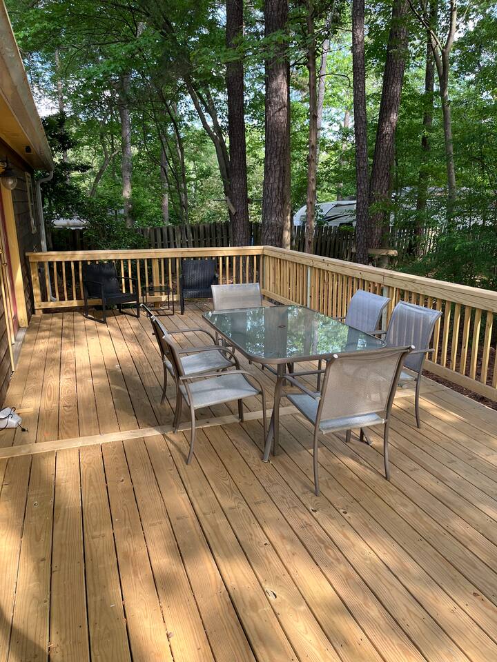 Welcome to our Cozy Sawmill Cottage in the heart of North Raleigh ! It's a 10-minute walk to Greystone Village with cafes, restaurants and shopping. We offer 1 King and 2 Queen beds, 55” Smart TV, a private backyard with a large deck and grill, coffee bar, and more. .☛ 6 miles from Duke, UNC and WakeMed Hospitals! .☛ 9 miles to NC State University! .☛ 18-minute drive to RDU Airport! Book with us and experience the best of Raleigh!
